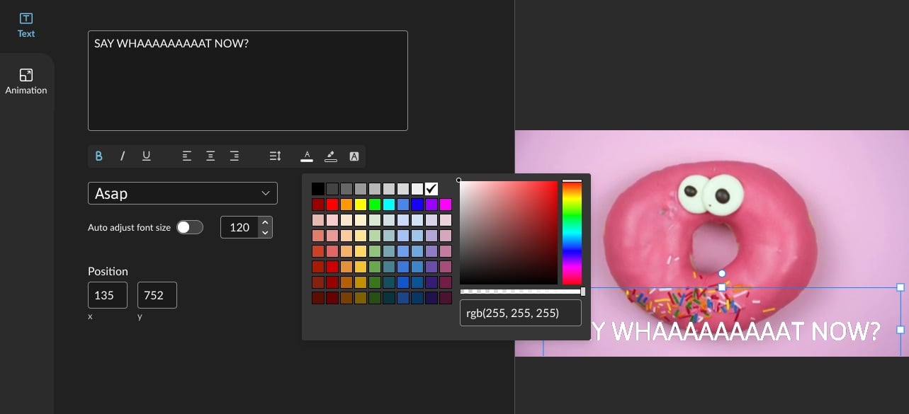 If you chose static text without motion, you can also open the Animation tab to animate it! By setting the start position and end position of the text, you can make your words fly in, move around, scroll across, or scale up and down. Animated text is a great way to add that extra little delight to your GIF-making.