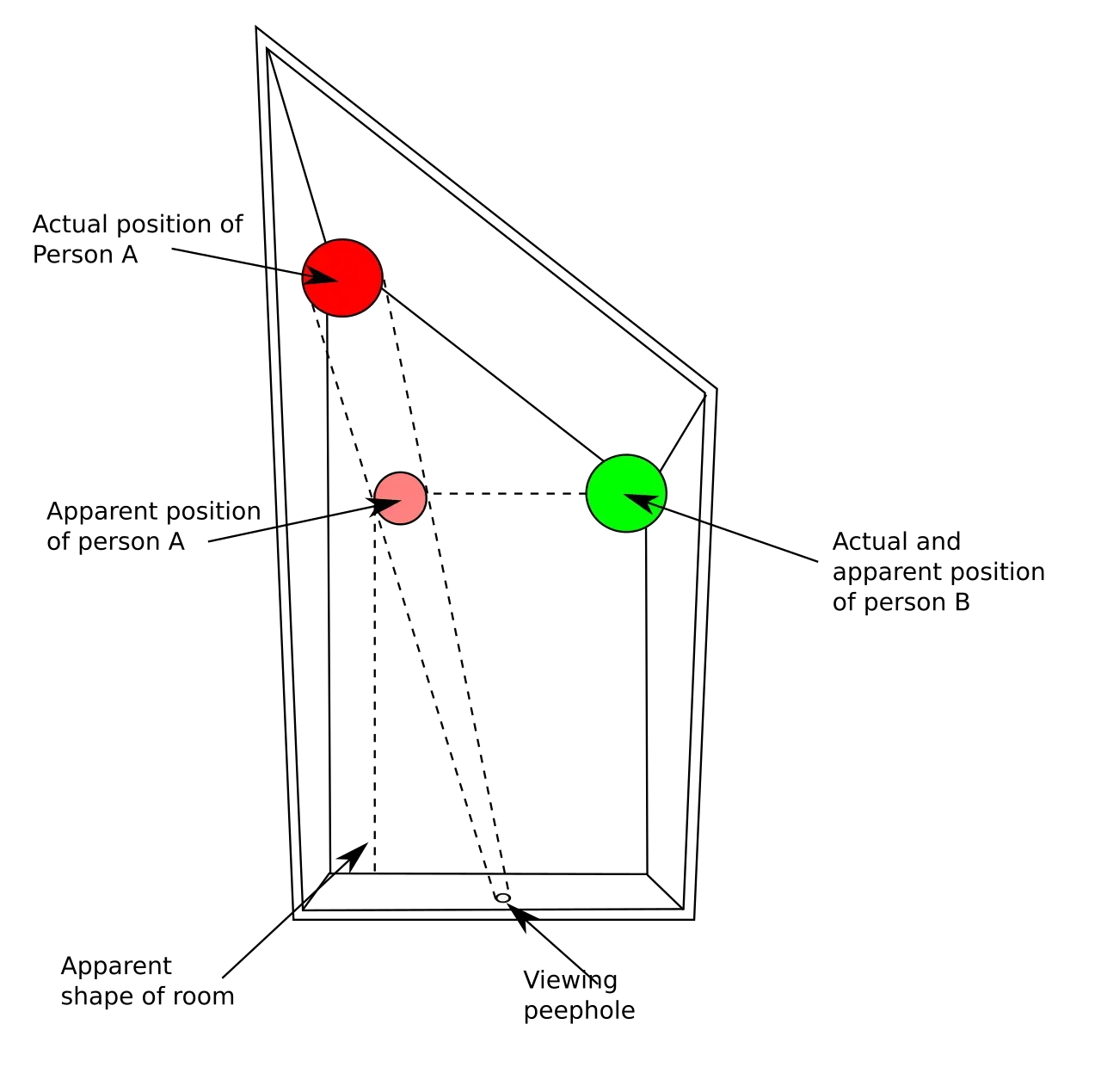 While the room appears normal at first glance, its true shape is an irregular hexahedron, with one corner positioned further from the observer than the other.