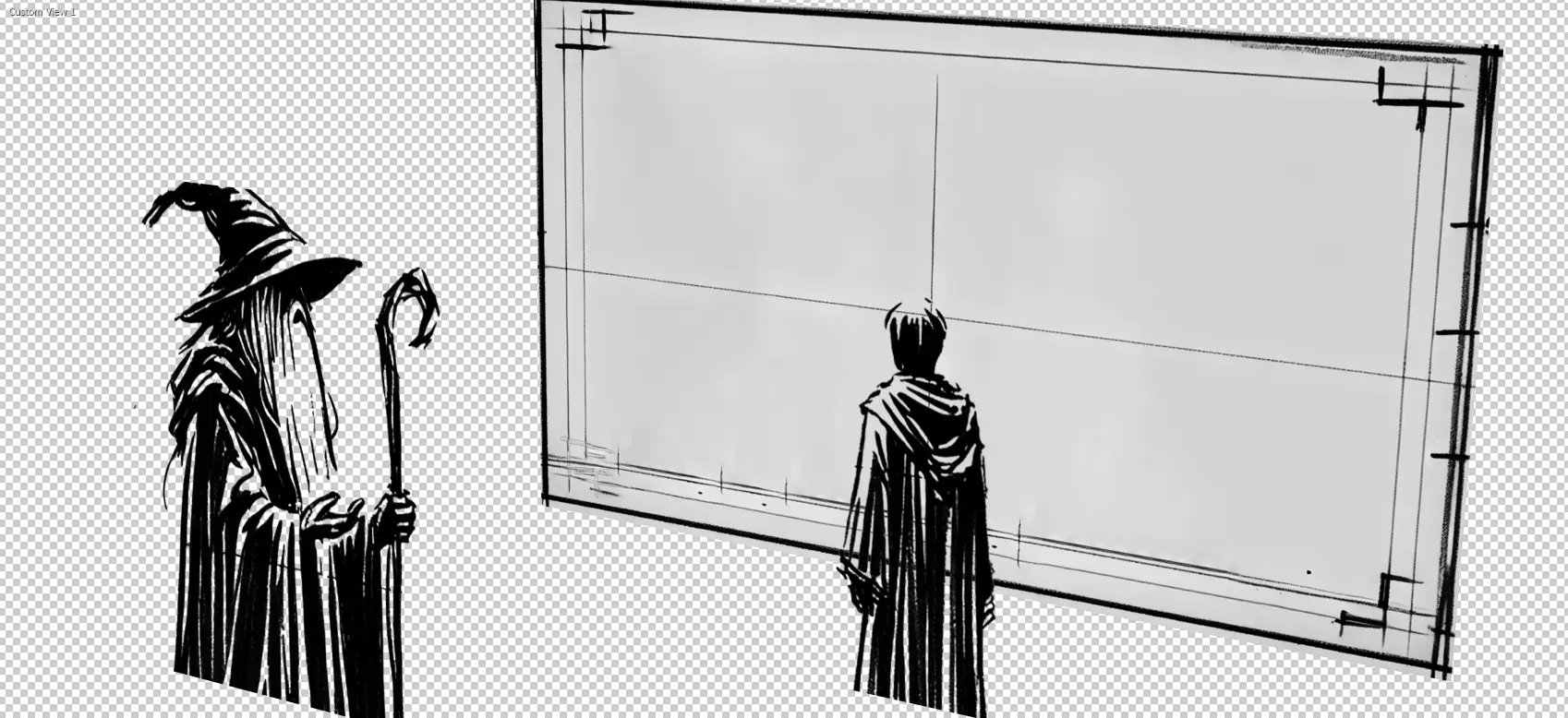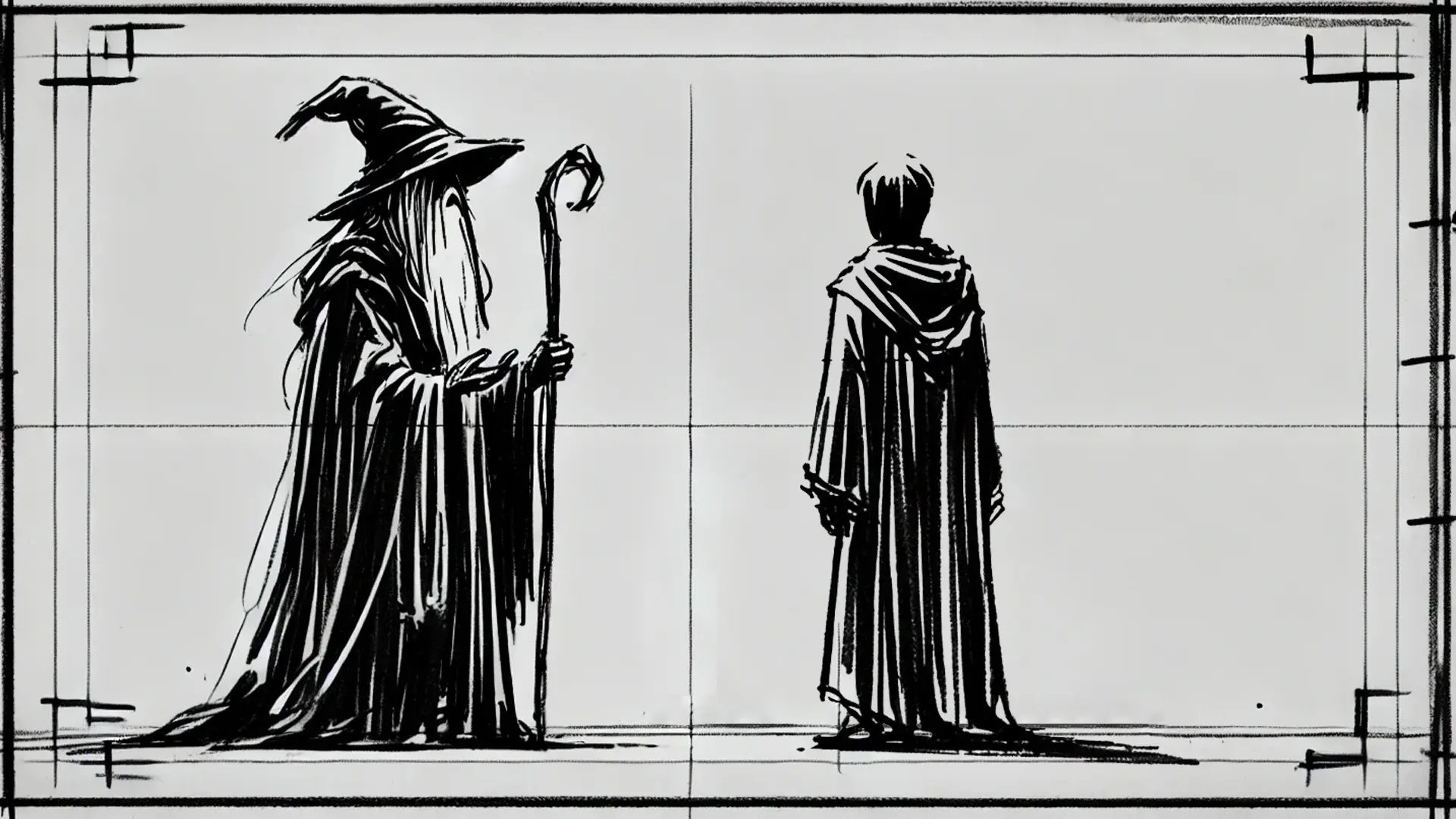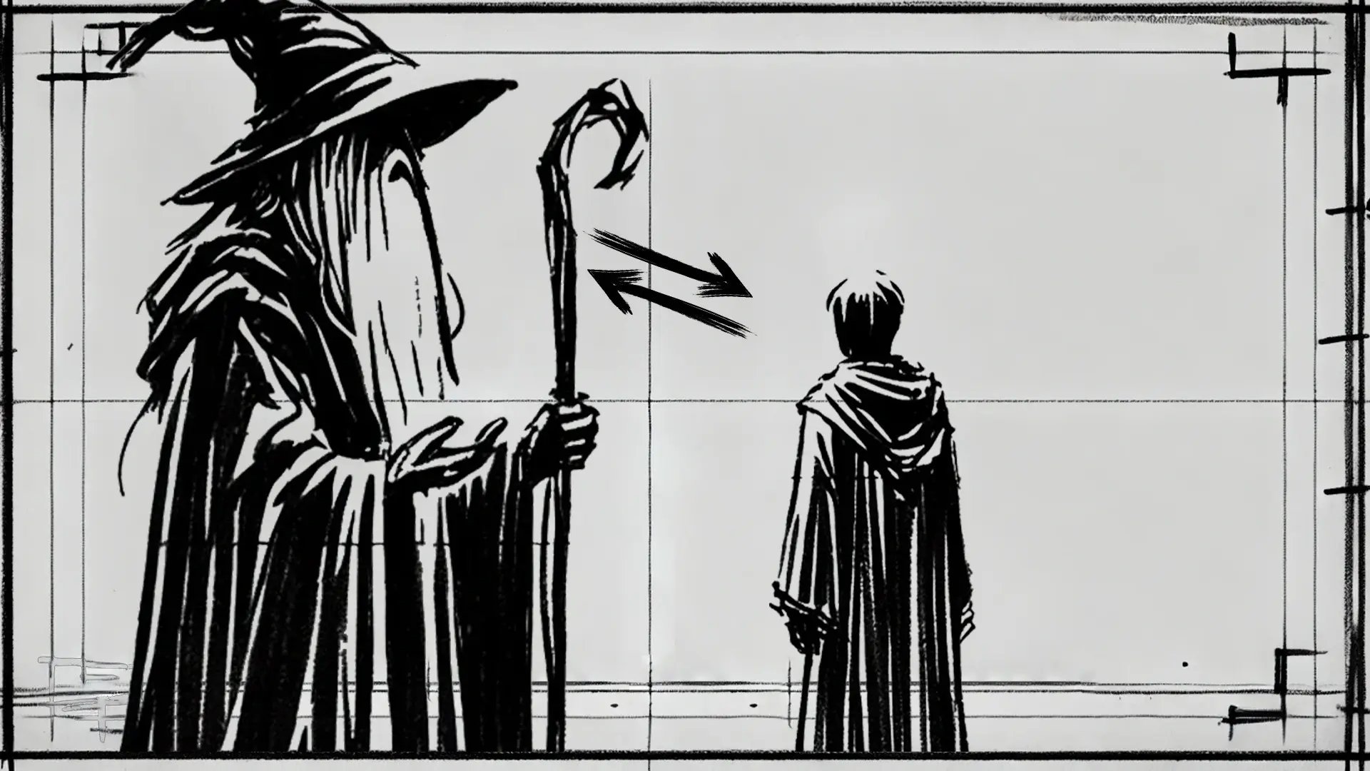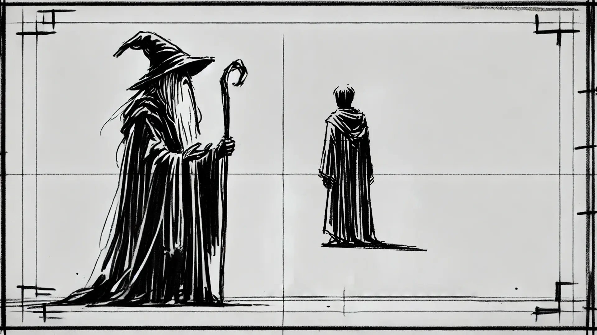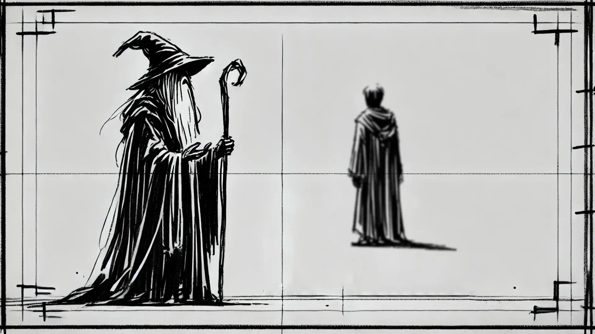 To demonstrate this further, let’s break down the concept in a storyboard, visually mapping out how the characters' positioning and camera angles work together to create the forced perspective illusion. Like "The Lord of The Rings," we’ll use a wizard character and his ward, but in our story, the Wizard is larger than life, and his companions are of average human height.