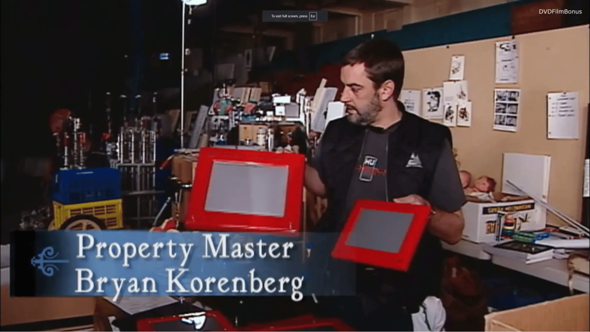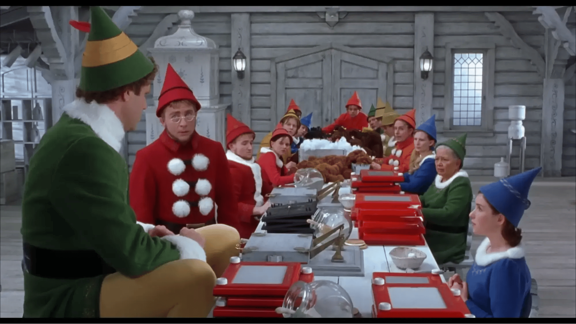 In the image above, from the making of “Elf,” Property Master Bryan Korenberg explains that they have two different-sized props available. One is for Buddy, the oversized elf, and the other is for the smaller, fantasy elves. While Will Ferrell’s character sits next to the regular-sized Etch A Sketch, the elf actors hold the larger prop to help convincingly sell the forced perspective.