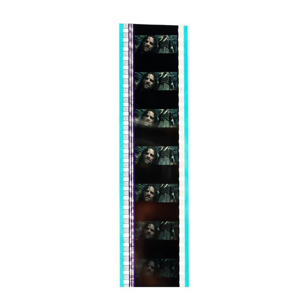 This image is of a film strip from “Lord of The Rings.” Each film frame is like a single picture. When loaded into a film camera, the film is fed from a magazine through the film gate, which is the area where the film is exposed to light. After each exposure, the film advances onto the take-up reel. The frame rate is determined by the speed at which each frame passes through the film gate.