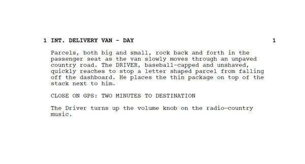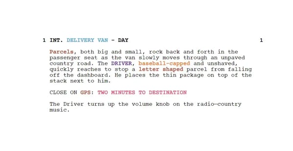 First, let’s look at scene one in the example script below to identify some of the production elements. These elements include anything that will appear on screen: props, cast, costumes, and even the location. Essentially, we want to prepare for anything that needs to be acquired for the shot to commence.