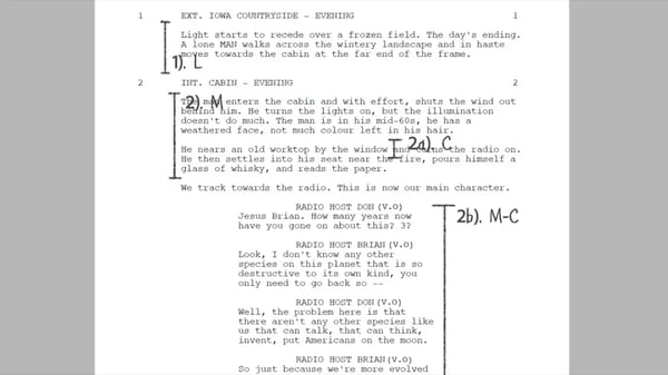 With the scene breakdown complete, the next step is to create a shot list from the scene. Again, there are two ways you can do this. If using pencil and paper, you can write on the script what type of shot you want for that specific dialogue length.