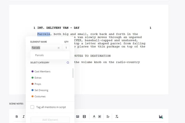 As the film's producers, we know this character is actually Adam. Therefore, we should click on cast members and tag all mentions of this character in the script so it applies across all the other scenes. Hit "add an element," and now "Adam" will be listed as a cast member in the elements drop-down list.