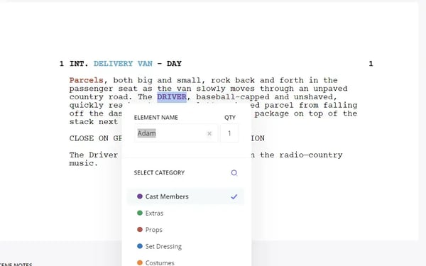 We can see that this scene also involves a character currently named DRIVER. In narrative filmmaking, it's customary to leave a character unnamed until they are introduced by dialogue. As such, script breakdown software may find multiple names for this character. However, due to the intuitive nature of the software, the unnamed character can be tagged with the actual character name to identify who needs to be present, even if they haven't been formally named yet.