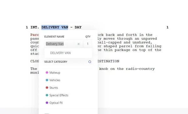 Right away, identify the props needed. If you're using paper, highlight these items to call attention. In software, simply double-click and select "props" — the program makes this incredibly easy. Regardless of which script breakdown software you choose, they all function similarly.