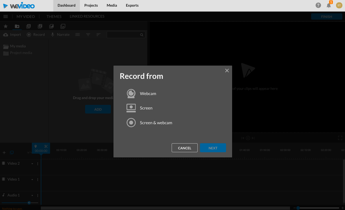 It all starts on the dashboard. Users will see a “Record” option at the top, which after clicking will let them choose from recording “Webcam”, “Screen” or “Screen & webcam.” Users can also decide what project it should go in.