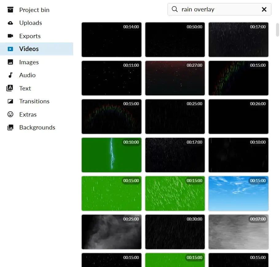 Since WeVideo has a built-in chroma key tool, we recommend using the rain overlays generated on a green screen, as they offer greater ease of use. Find the correct overlay and drag it onto the "rain" track.