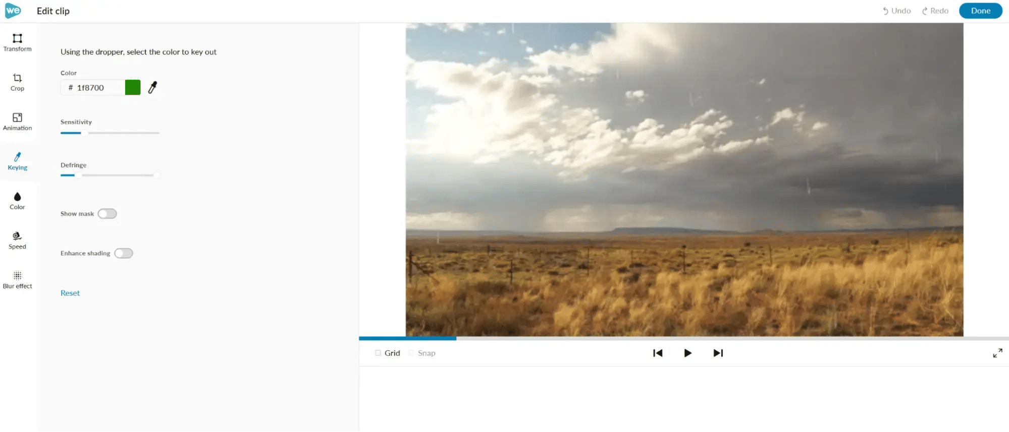Click the rain overlay, then select Edit (keyboard shortcut E). Next, select Keying. Use the color picker to select the green within the preview monitor. We recommend adjusting the keying parameters to achieve the best results.