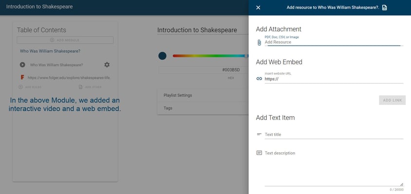 You’re not limited to video content for each module you create. Add supplemental resources (PDF, DOC, and CSV attachments, website pages, or text items like instructions, educator insights, etc.).
