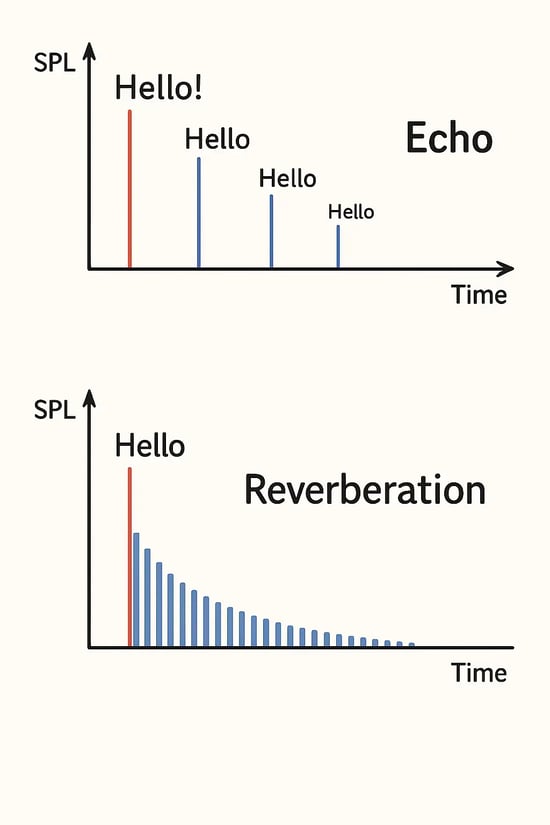 Conversely, reverb produces reflections that reach us a few milliseconds after the initial sound. These are early reflections, followed by a reverberant decay that tapers off over time. The reflection also blends in with the initial sound, whereas an echo is distinct, may even appear a second or so after the initial sound, and will echo many times.